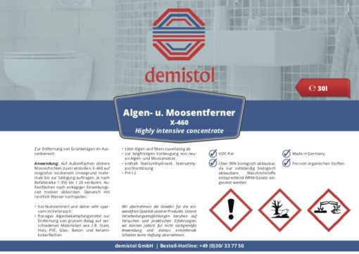 Anwendung: Auf Außenflächen dickere Moosschichten zuvor abstoßen. X-460 auf möglichst trockenem Untergrund mehrmals bis zur Sättigung auftragen. Je nach Befallstärke 1:350 bis 1:20 verdünnt. Außenflächen nach eintägiger Einwirkungszeit trocken abbürsten. Danach mit reichlich Wasser nachspülen.